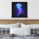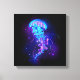 Grande méduse bleue, artistiquement dessinée, brillante, brillante, avec de longues tentacules sur arrière - plan noir avec bioluminescence violette. Méduse brillante.
