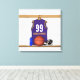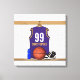 Maillot de basketball violet et or suspendu dans un vestiaire avec un basket, des baskets de basket et une bouteille de boisson. Le maillot est personnalisable avec vos propres numéros et nom, pour créer un cadeau vraiment unique pour le joueur de basket ou de basket
