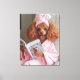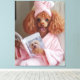 Image hyper réaliste d'un charmant caniche se reposant dans un peignoir rose avec une serviette assortie enroulée autour de la tête. L'adorable chien est confortablement assis sur une chaise, tenant un magazine avec un autre caniche sur la couverture. Son expression ludique et son cadre luxueux à la spa font de cette scène à la fois mignonne et amusante.