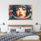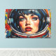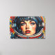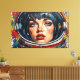 L'œuvre d'art numérique d'Otis Porritt présente un gros plan saisissant du visage d'une femme, encadré dans la visière réfléchissante du casque d'un astronaute. Ses yeux bleus intenses, ornés de longs cils, et ses délicates taches de rousseur attirent le spectateur, contrastés par des lèvres rouges vibrantes. La pièce est rendue avec des traits audacieux et expressifs qui imitent une riche texture d'impasto, créant une surface visuelle dynamique. Une palette vive de bleus profonds, de jaunes vifs et de rouges ardents domine, avec un motif ludique à pois qui anime l'arrière-plan, renforçant la présence énergique et captivante de l'œuvre.