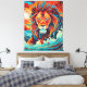 Lion's Fire Dance Canvas Imprimer Impression de toile vibrante représentant un lion majestueux entouré de vagues tourbillonnantes et de flammes scintillantes, créant une danse fascinante de couleurs et d'éléments.