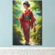 Cette oeuvre captivante représente une femme japonaise dans un kimono rouge vif, orné d'élégants motifs floraux, marchant gracieusement le long d'un chemin pavé aux applis du soleil. Elle tient une lanterne délicate, ses lunettes rouges se balancent doucement tandis qu'elle se déplace dans un jardin paisible et verdoyant. La riche végétation, ponctuée d'éclats de fleurs colorées, crée un décor tranquille, tandis qu'un toit de temple japonais traditionnel surplombe les arbres, évoquant un voyage sacré. La lumière douce et éthérée qui filtre à travers le feuillage illumine son expression sereine, suggérant un moment de contemplation tranquille et de beauté intemporelle.