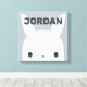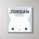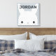 Ce design présente un petit lapin mignon avec un nom personnalisé dans un style de police sans empattement gris moderne sur un fond gris clair.