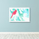Ce canvaste enroulé présente un beau cardinal rouge assis sur une branche enneigée d'un pin qui regarde les flocons de neige descendre du ciel pour couvrir le terrain d'une neige blanche.