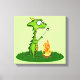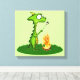 Petit dragon mignon de bande dessinée avec de grands yeux écarquillés et un klaxon jaune grillant une guimauve au-dessus d'un feu de camp. Art numérique original de bande dessinée par Taylor Addams.