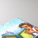 Art de la lecture estivale de Traci Van Wagoner présente un garçon et une fille assis dans un jardin urbain, les pieds dans un bain cool, en train de boire de la limonade et de lire des livres. Un chat et un chien s'allongent à leurs pieds sur le pont de bois. Parfait pour les amateurs de livres et de bibliophiles de tous âges.