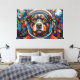 Cette œuvre d'art vibrante présente un gros plan captivant du visage d'un chien, encadré dans la visière claire du casque d'un astronaute. Réalisé avec des traits audacieux et texturés dans une palette dynamique d'orangés, de bleus et de rouges, le regard expressif du canidé rencontre le spectateur. L'arrière-plan se déploie en une étendue cosmique stylisée, présentant des planètes lointaines et des formations éparses rappelant des nébuleuses, le tout rendu avec un effet tactile, presque impasto. Le détail complexe de la fourrure et du casque contraste avec les éléments énergiques et abstraits de l'espace environnant, créant une narration visuelle saisissante.