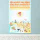 Une affiche lumineuse et charmante montre un dessin spectaculaire de la Californie du Sud - Los Angeles, Anaheim, Long Beach, San Diego. Cette scène pleine de charme a tout pour plaire - un surfeur y accroche dix fois tandis qu'une sirène s'installe sur un rocher, qu'une baleine meurtrière saute de l'eau, qu'un couple de plage musclé flex to impress, des animaux de zoo attendent les touristes, qu'un taureau frappe dans un chasseur de taureaux, et bien plus encore...