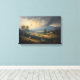 Une puissante peinture à l'huile classique représentant une vaste vallée montagneuse lors d'un changement de temps dramatique. La lumière du soleil perce à travers de lourds nuages d'orage sombres pour illuminer une paisible prairie alpine où des moutons paissent près d'une cabane rustique de montagne. Un ruisseau sinueux coule vers des sommets lointains enneigés sous un ciel lumineux et atmosphérique. Ce chef-d'œuvre capture la beauté sublime de la nature sauvage, rendue avec les textures riches et les techniques d'éclairage des maîtres paysagistes du XIXe siècle.