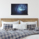 Impression de toile avec l'image d'un loup mystique magique debout dans une forêt avec de la neige douce tombant autour. C'est des yeux bleus qui attirent vraiment votre attention.