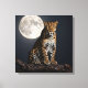 A powerful leopard with piercing yellow eyes and a sleek, spotted coat sits majestically on a stark, solitary branch. One paw dangles artfully across the center of the illustration, hinting at movement. Behind him, a vast, luminous harvest moon hangs in the inky night sky, casting an ethereal glow. Awesome wall art for anyone who loves leopards.