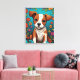 Adorable art de l'air blanc avec un chien chiot brun et blanc entouré de fleurs d'art populaire en rose, orange et violet.
