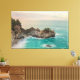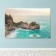 Cette image capture une vue pittoresque des chutes McWay à Big Sur, en Californie. Une cascade descend d'une falaise rocheuse vers une plage de sable. L'eau turquoise de l'océan entoure la plage et les formations rocheuses. Le ciel est rempli de douces couleurs pastel, suggérant soit le lever du soleil soit le coucher du soleil. Des arbres sont visibles au-dessus des falaises et des formations rocheuses. L'ambiance générale est sereine et pittoresque.