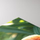 Une scène vibrante est entourée d'un grand flamand à côté de son poussin qui se brise dans l'eau, entouré d'un feuillage verdoyant.