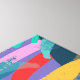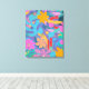 Cette peinture murale en toile colorée présente de l'art abstrait dans un style de bloc de couleur en bleu, violet, orange, jaune, rose, rouge et vert avec un bleu marine arrière - plan et des formes de doodle amusantes comme des fleurs, feuilles, cercles, carrés et points