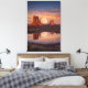 This stunning canvas print captures a breathtaking desert landscape inspired by Monument Valley at dusk, where iconic red sandstone buttes rise beneath a glowing supermoon. The moon appears low on the horizon, perfectly reflected in calm water, creating a powerful mirror effect that brings balance, depth, and serenity to the scene.