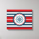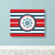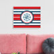 Design nautique avec décoration de boussole en forme ronde sur arrière - plan rayé rouge, bleu et blanc