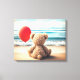 Un nounours est assis seul sur une plage de sable, tenant un ballon rouge tout en regardant l'océan serein sous un ciel parsemé de nuages duveteux