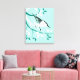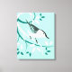 Bird art canvas prints of White Breasted Nuthatch perched on decorative branch with leaf pattern on light blue background