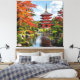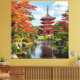 Un point de repère architectural japonais serein au milieu d'un feuillage rouge et orange vif qui se reflète sur un étang calme. Le ciel bleu clair met en valeur le paysage paisible, symbolisant la tranquillité et la beauté de la culture traditionnelle.