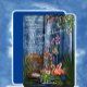 Colonnes de marbre bleu, arcades d'un palais d'imaginaire intérieur, avec escaliers menant à un étang d'eau, verdure, plantes, fleurs roses, flamants roses et chaise de lecture de canne à l'ancienne.