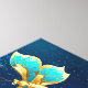 Or volant, papillon bijoux sur arrière - plan textuel bleu. Conception avec papillons.