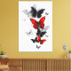 Un troupeau de papillons de morpho volants, réalistes, rouges et noirs sur un arrière - plan blanc avec des gouttes de peinture.