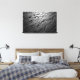 Photographie en noir et blanc, contraste élevé, de rivulets sur une plage de sable.