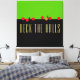 Ce design de vacances moderne et festif présente des blocs de couleur vert citron et noir éclatants avec une haute typographie élégante DECK THE HALLS texte dans la partie inférieure du design. Des baies abstraites rouge vif et de petits arbres verts s'installent sur le bord "mantel" des deux panneaux de couleurs.