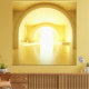 Un espace architectural surréaliste dans des tons jaunes chauds, présentant des arches en couches, une ouverture centrale lumineuse et des éléments sculpturaux tels qu'une sphère et une plateforme à degrés. La géométrie propre et les reflets doux créent une atmosphère calme et futuriste idéale pour les maisons modernes, les studios créatifs, les bureaux et les intérieurs de type galerie.