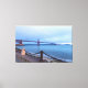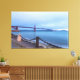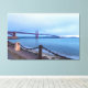 Une photographie capture l'emblématique Golden Gate Bridge à San Francisco, enveloppé d'une épaisse couche de brouillard. La structure rouge du pont se détache du ciel bleu et de l'eau brumeuse en dessous. Au premier plan, une clôture à chaînons et un poteau en béton mènent l'oeil du spectateur vers le majestueux pont.