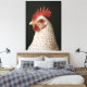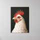 Portrait hyper-réaliste d'un poulet tacheté aux plumes rouges et blanches, peigne et wattles détaillés, dressé contre un arrière - plan sombre.