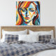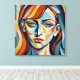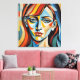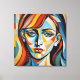 Peinture cubiste représente un visage féminin fragmenté en sections géométriques colorées. Les traits du visage sont définis par des contours noirs audacieux, tandis que des teintes vives de bleu, rouge, jaune et vert créent un contraste dynamique. Le style évoque l'influence de Picasso avec sa décomposition des formes et sa palette expressive, suggérant différentes perspectives et émotions simultanées.