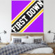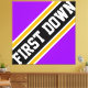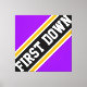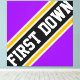 Ce design sportif de football présente du texte athlétique FIRST DOWN à l'intérieur mis en surbrillance de larges bandes de course en diagonale noir, blanc et jaune doré contre un arrière - plan violet brillant. Les premières et les dernières lettres du texte s'exécutent sur les arêtes de conception avec un effet de bannière dynamique. Les couleurs et le texte de ce design peuvent être personnalisés.