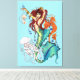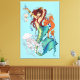 Sirène aux cheveux rouges portant des bijoux en or. La sirène a une queue turquoise, bleue et verte. Autour de la sirène se trouve un hippocampe, des méduses, des coquillages et des bulles d'eau, le tout en toile de fond bleu