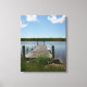 A weathered wooden dock stretches out across calm water beneath a bright blue sky in Michigan’s Upper Peninsula. Surrounded by forest and still water, this peaceful lakeside scene captures the quiet beauty of northern Michigan summers.