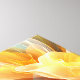 The image showcases an abstract floral design with a vibrant color palette. The artwork features layered, petal-like shapes in shades of yellow, orange, white, and turquoise. These translucent forms create a sense of depth and movement, resembling stylized flowers. The background is dark, which makes the colors pop.