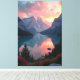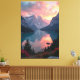 Des montagnes majestueuses s’élèvent contre un ciel rose et orange, dont les couleurs se reflètent parfaitement sur la surface cristalline du lac. Des fleurs vives ornent l'avant-plan, tandis qu'un bateau silencieux flotte sur les eaux tranquilles. Cette scène reflète la sérénité de la nature au crépuscule, mêlant grandeur et délicatesse en un instant - parfait pour évoquer la paix et se demander la beauté du monde sauvage.