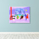 Cette Retro Tropical Cocktail Party Stretched Canvas Print est enivrant dans ses détails. Le dessin animé présente le type de cocktail extrêmement sophistiqué que l'on ne voit normalement que dans les films des années 1960. Un salon moderne du milieu du siècle est rempli de fêtards qui apprécient la décoration chic et violette. Une jolie femme en uniforme de domestique française porte un plateau de martinis. Elle se tient à côté d'une cheminée rouge à cônes avec un feu rugissant. Au centre de la pièce, un beau couple s'installe dans des chaises à oeufs d'orange. La femme porte une robe verte et brillante. L'homme porte un costume noir avec une cravate rouge. Ils tiennent chacun un martini. Un autre couple devient cosy sous un lustre suspendu, jaune, Spoutnik. Le distingué homme aux cheveux blancs porte un costume bleu, une chemise bleu clair et une cravate rouge. Il tient aussi un martini dans chaque main, montrant au monde que ses jours de fête sont loin d'être terminés. Son compagnon est une blonde en forme dans une robe rouge étonnante. Derrière cette scène, on peut voir à travers des murs en verre du sol au plafond. La scène extérieure dispose d'une piscine ronde et turquoise. On peut voir la silhouette violette d'une femme plongeant ses jambes dans l'eau. Entre les murs violets et en pierre, il y a des silhouettes de palmiers. Les silhouettes de danses et de fêtards parlants sont également visibles. S'il y a une chose que cela prouve, c'est que, tandis que les gens qui vivent dans des maisons en verre ne devraient pas jeter des pierres, ils devraient certainement jeter des fêtes !