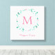 Impression en toile carré avec monogramme de bébé en rose à l'intérieur d'une jolie couronne de rosebuds. C'est un beau cadeau pour les nouveaux parents à accrocher à la crèche.