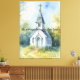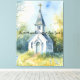 This serene countryside scene captures a quaint white chapel nestled at the end of a winding dirt path, surrounded by blooming wildflowers and softly swaying grasses. Rendered in a delicate watercolor style with painterly splashes and gentle light, the composition evokes peace, nostalgia, and quiet faith. The wildflower meadow—full of bluebells, daisies, and soft greens—creates a dreamy, almost ethereal foreground that leads the viewer’s eye toward the charming steepled church under a calm blue sky. Perfect for evoking a sense of retreat and reflection, this design works beautifully as seasonal decor, especially for spring and Easter themes. It pairs well in cozy cottagecore spaces or country-inspired settings, bringing warmth and spiritual calm to any room. The golden cross atop the steeple and gothic-style arched doorway add vintage architectural charm while maintaining a harmonious balance with the natural surroundings. This is an inviting visual retreat into simplicity, faith, and nature. AI generated artwork.