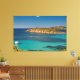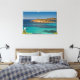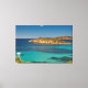 Une belle toile imprimée d'une photo originale de l'eau cristalline ultra transparente de la mer Sardaigne bleu clair dans toutes les nuances de turquoise, entourée d'un maquis méditerranéen vert avec un petit îlot et quelques bateaux au loin par une journée ensoleillée d'été.