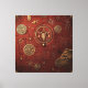 An ornate emblem glows in gold against a textured crimson backdrop, surrounded by arcane symbols and cryptic inscriptions.