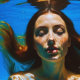 "Selene" - Les Femmes Dans L'Eau. Dans cette scène d'eau féminine aux beaux-arts sereine et colorée, une belle femme aux longs cheveux rouges flotte dans une mer tourbillonnante bleue. La lumière du soleil ébranle son visage paisible sous la surface de l'eau. Les yeux fermés et le visage levé, elle absorbe la lumière, incarnant une figure forte, résiliente et inspirante dans cette image multicolore.