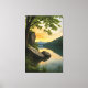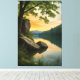 Au bord du lac, où reposent les rochers et où les arbres encadrent la vue, le ciel peint dans les tons dorés et bleus rencontre son reflet dans l'eau calme. Une oeuvre d'art qui transporte la paix, le lien avec la nature, et la beauté intacte du coucher du soleil.