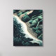 Serene Shores: This stunning top-down illustration the harmony of land and sea, featuring waves wgently breaking on sandy beaches with lush green mountains in the background. Rendered in soothing shades of dark blue-green, the artwork evokes a sense of tranquility and balance. The intricate details of the ocean’s patterns meeting the shore, paired with the trees lining the water’s edge, enhances the peaceful atmosphere. Created in a woodcut print style with simple lines and a flat design, the piece is reminiscent of hand-drawn animation, offering a timeless, serene depiction of nature's beauty.