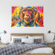 Cette œuvre d'art vibrante présente un gros plan captivant du visage d'un chien, encadré dans la visière claire du casque d'un astronaute. Réalisé avec des traits audacieux et texturés dans une palette dynamique d'orangés, de bleus et de rouges, le regard expressif du canidé rencontre le spectateur. L'arrière-plan se déploie en une étendue cosmique stylisée, présentant des planètes lointaines et des formations éparpillées rappelant des nébuleuses, le tout rendu avec un effet tactile, presque impasto. Le détail complexe de la fourrure et du casque contraste avec les éléments énergiques et abstraits de l'espace environnant, créant une narration visuelle frappante.
