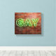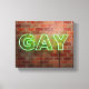 SlipperyJoe illuminé gay néon signe clair éclatant électrique vert lumières lettres montées rouge-brun mur en brique gay pride cadeaux d'identité célébration LGBTQIA urbain industriel look célébration amour identité communauté vivre votre vérité visibilité puissance éclatante contrastes texturés fond de page élégant électrique courbes artistiques casting vivante aura