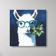 Playful twist to cute animal art and humor with a quirky white llama rocking teal glasses and holding a leafy branch.