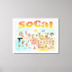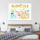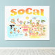 Une scène lumineuse et colorée offre une vue spectaculaire de la Californie du Sud - personnages farfelus sur la plage et le désert de SoCal présentant Los Angeles, San Diego, Orange County, Père Noël Barbara, Riverside, Palm Springs, Anza Borrego et Joshua Tree parcs ainsi que les villes frontalières de Tijuana, Tecate et Mexicali. Cette scène pleine de charme a tout - un surfeur pend dix tandis qu'un orque saute de l'eau, des animaux de zoo accueillent les touristes, un couple de plage musclé à flex pour impressionner comme un T-Rex rugit un défi et un réservoir se met en position et bien plus encore...